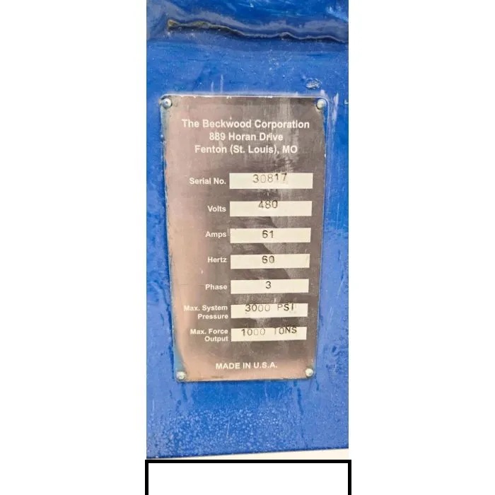 1000 Tons x 8" Used Beckwood Hydraulic 4 Post Pad Forming Press, Mdl. 4P1000F4860, PLC Micrologic 1000 (PC),PLC Programed, Note: Posts Turned Down to 8" Center Section With Side Frame Support Plates (2x) 1-1/2" x 37" x 126 1/4",Ram Cylinders by Parker Hydraulics, Eagle Eye Light Curtain, 3" Thick Urethane (Has Some Splits)- This is the custom Pad that Robinson Helicopter was Using, New Replacement Cost Over $850,000, Great For Hydraulic Press Forming Shallow Parts- Die Samples In Photos Year 2004