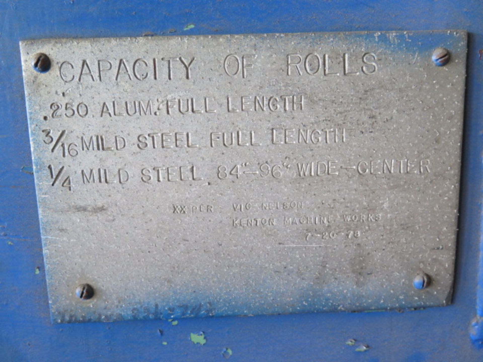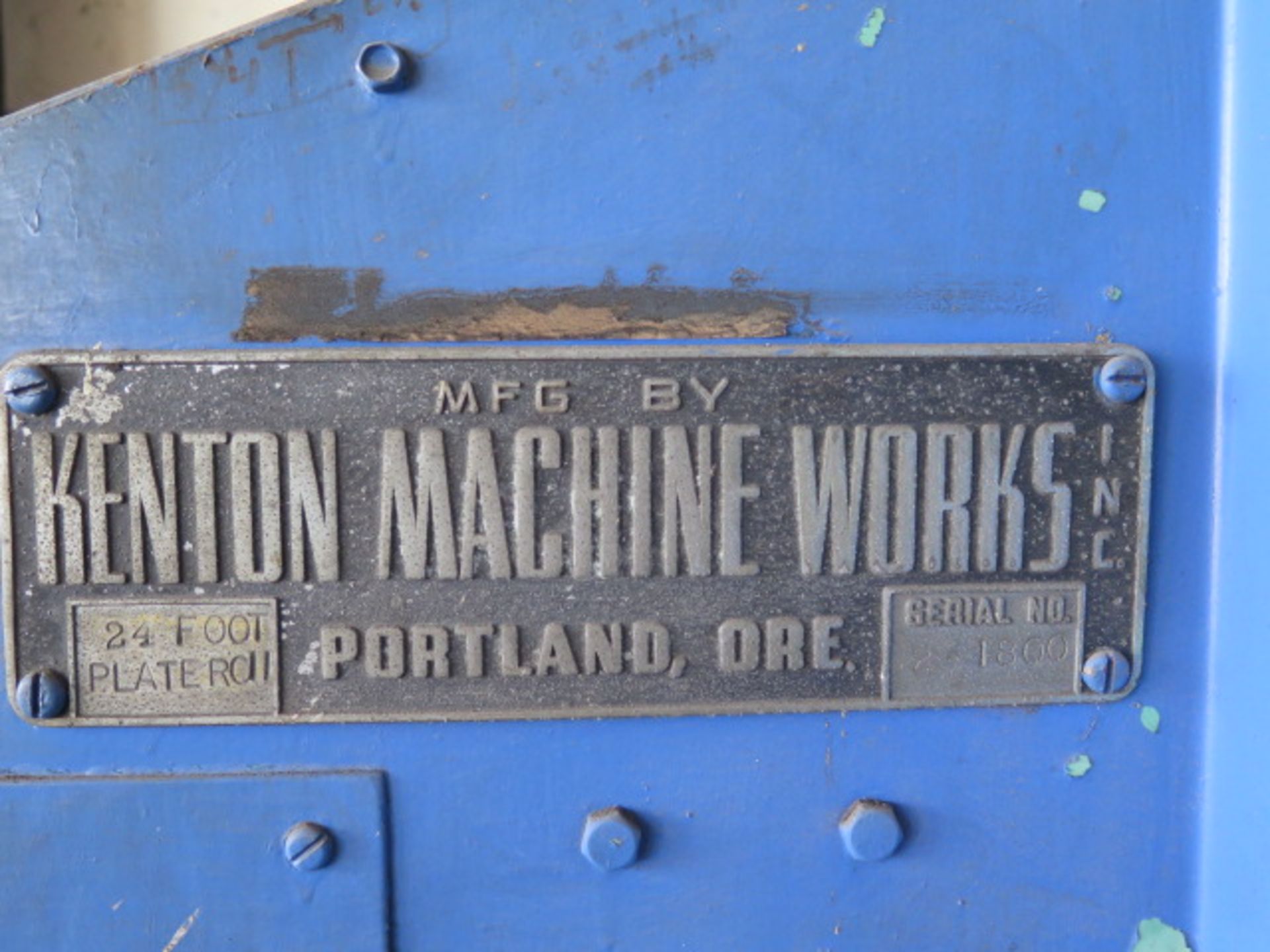 Kenton Machine Works 24’ Plate Roll s/n 1800 w/ 14” Rolls, ¼” Aluminum – 3/16” Mild Steel Full Length, ¼” Mild Steel 8’4”-9’6”