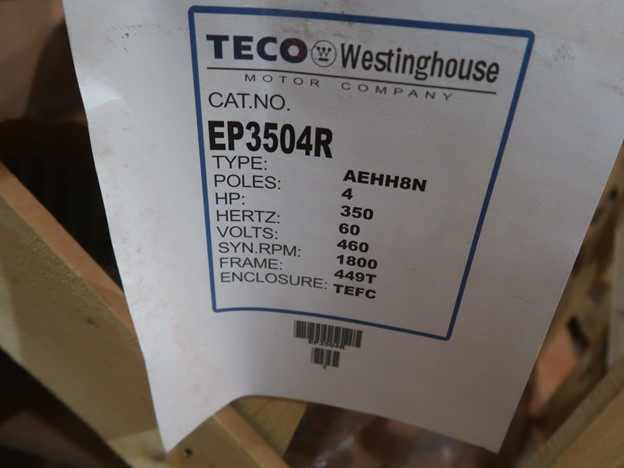 Teco 350 HP motor, 460 volt, RPM 1,800, 3 ph., frame 449T