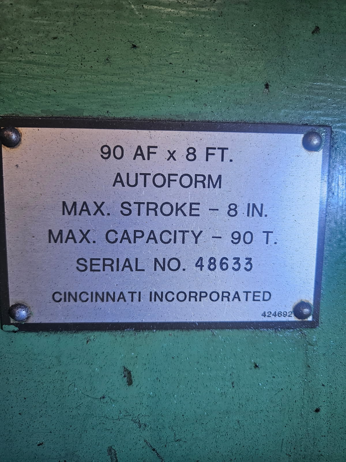 90 Ton Cincinnati Model 90 AF X 8 Ft. Hydraulic Press Brake Autoform