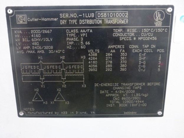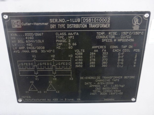 2000-2667 KVA; 4160 High Voltage; 480 Low Voltage; Tag: 243673