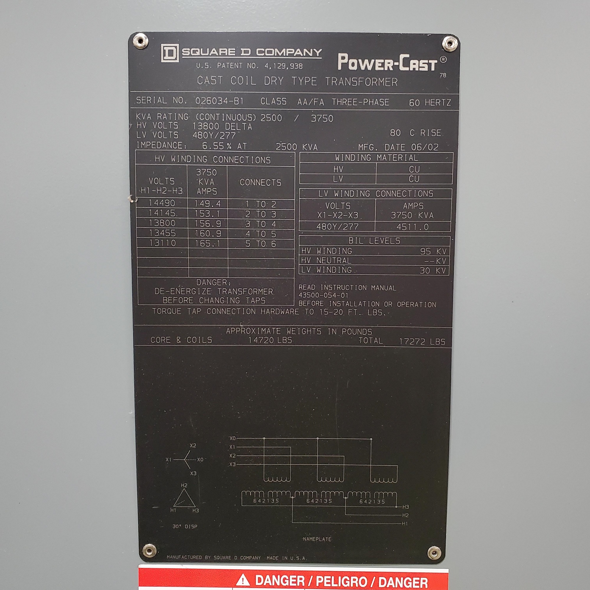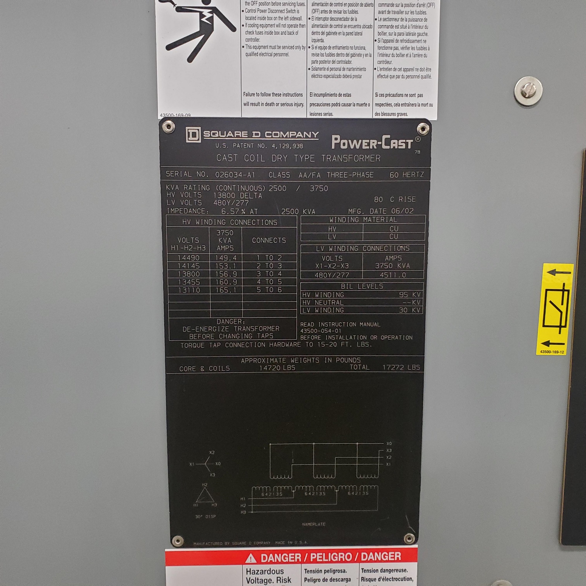 Square D 2500 KVA, 13800 Delta, 480Y/277 3 Ph 60 Hz power cast Transformer