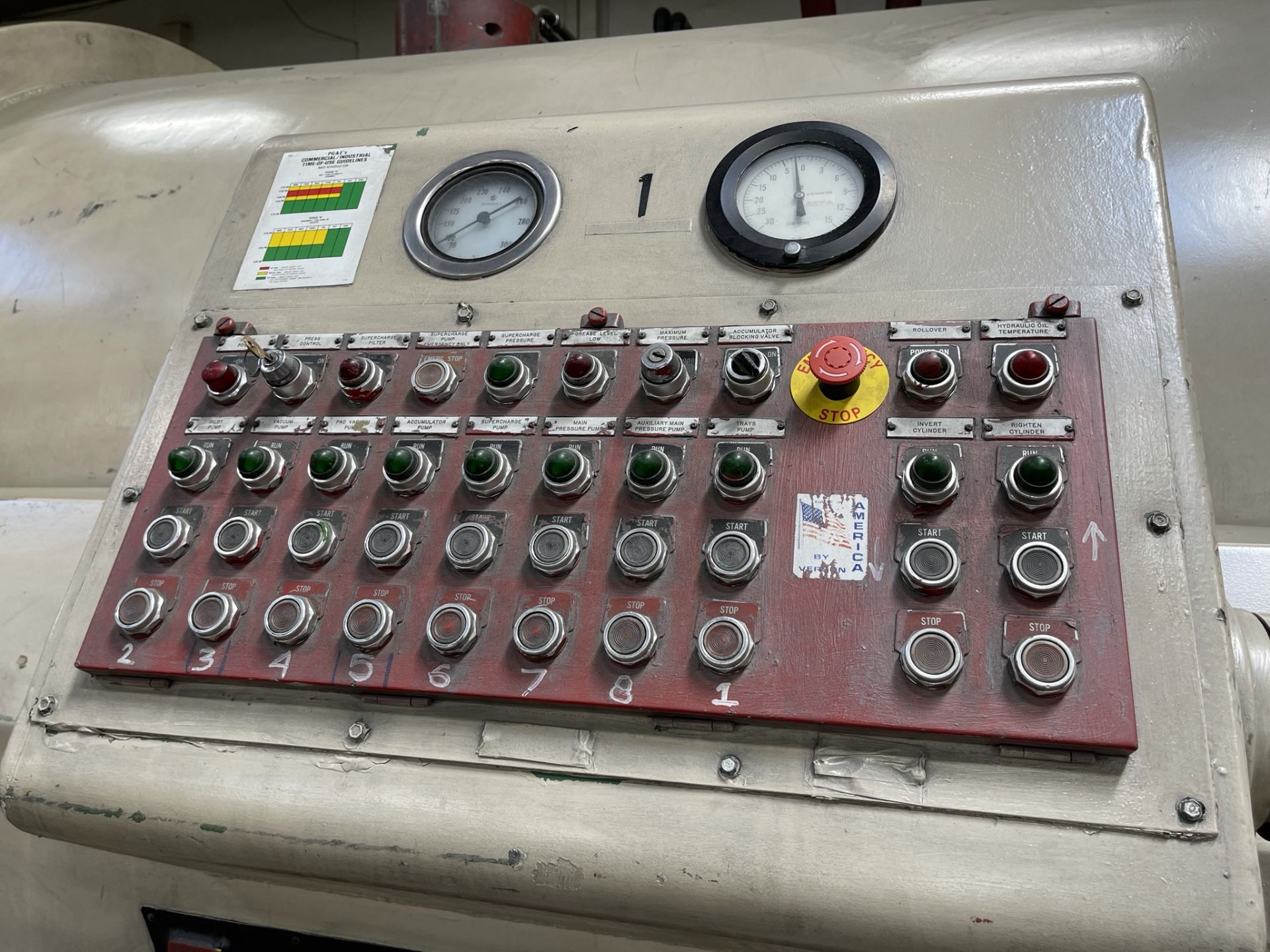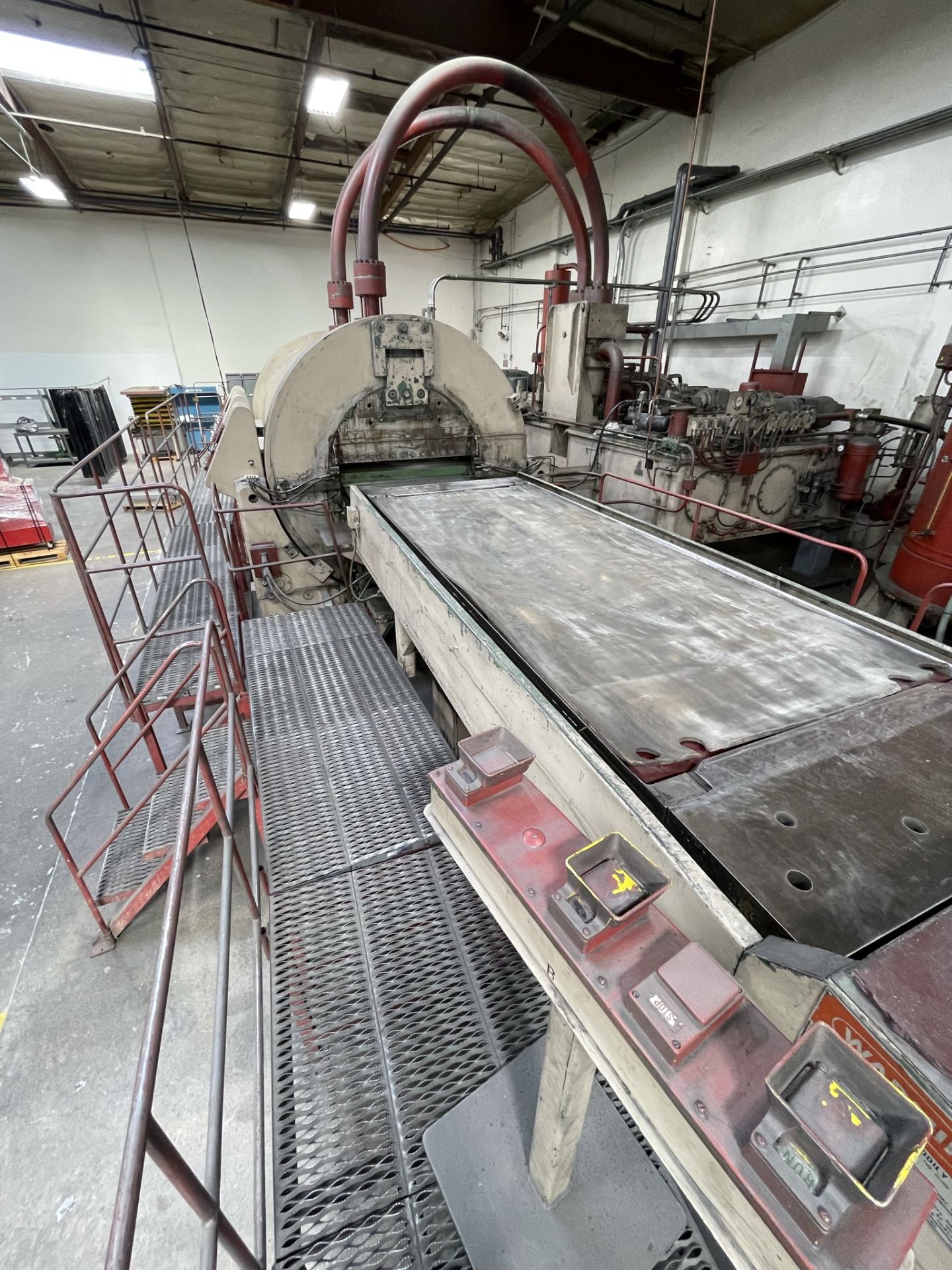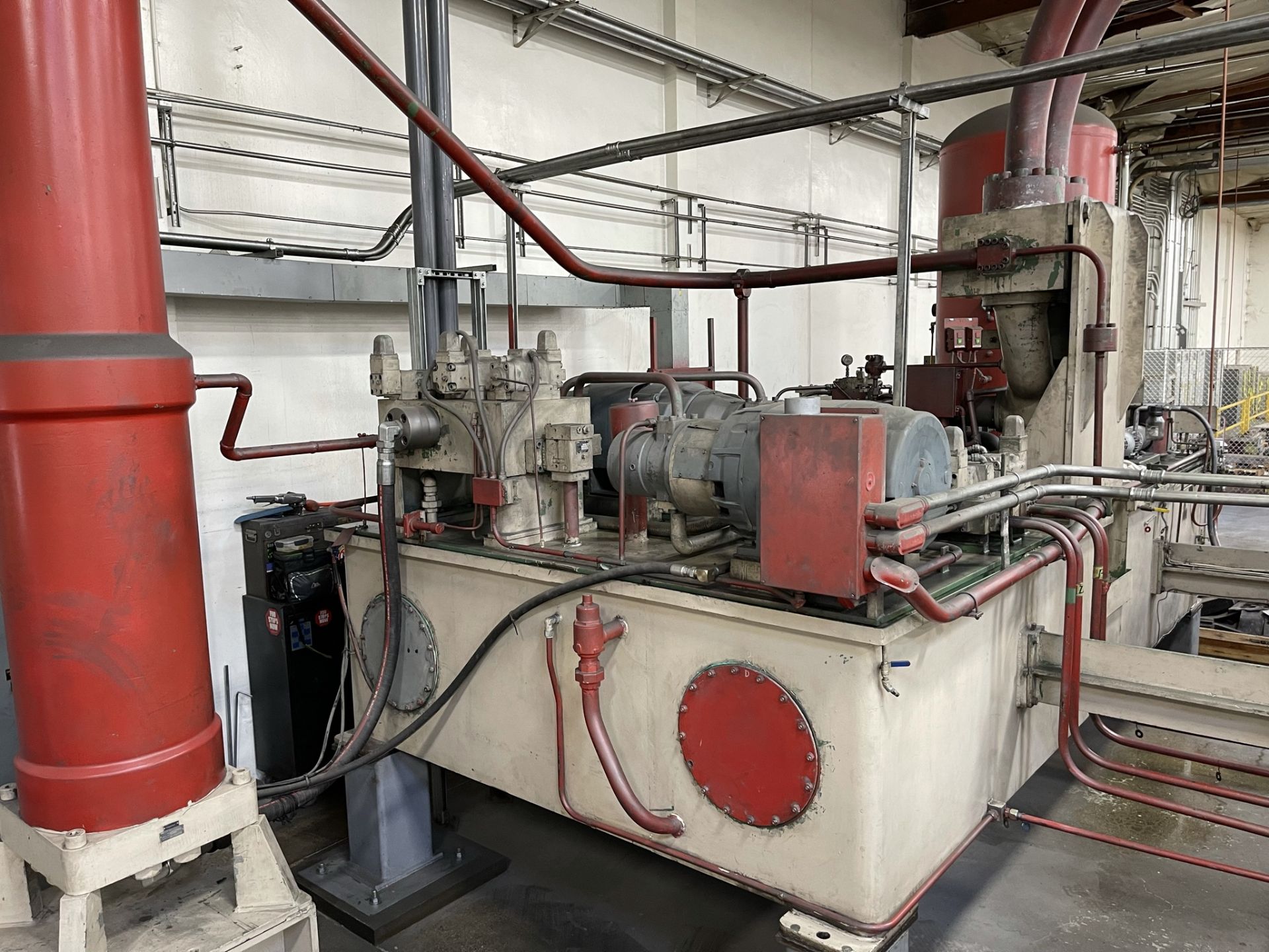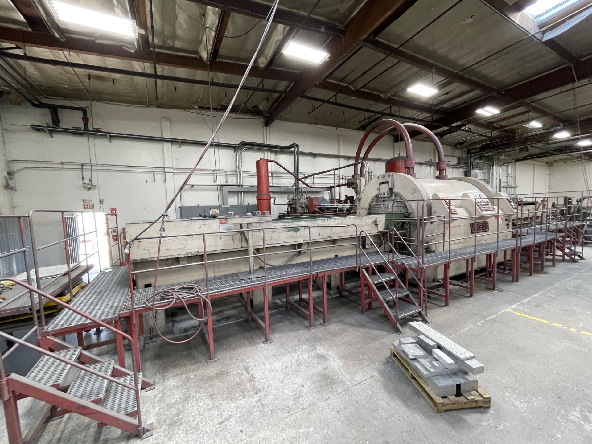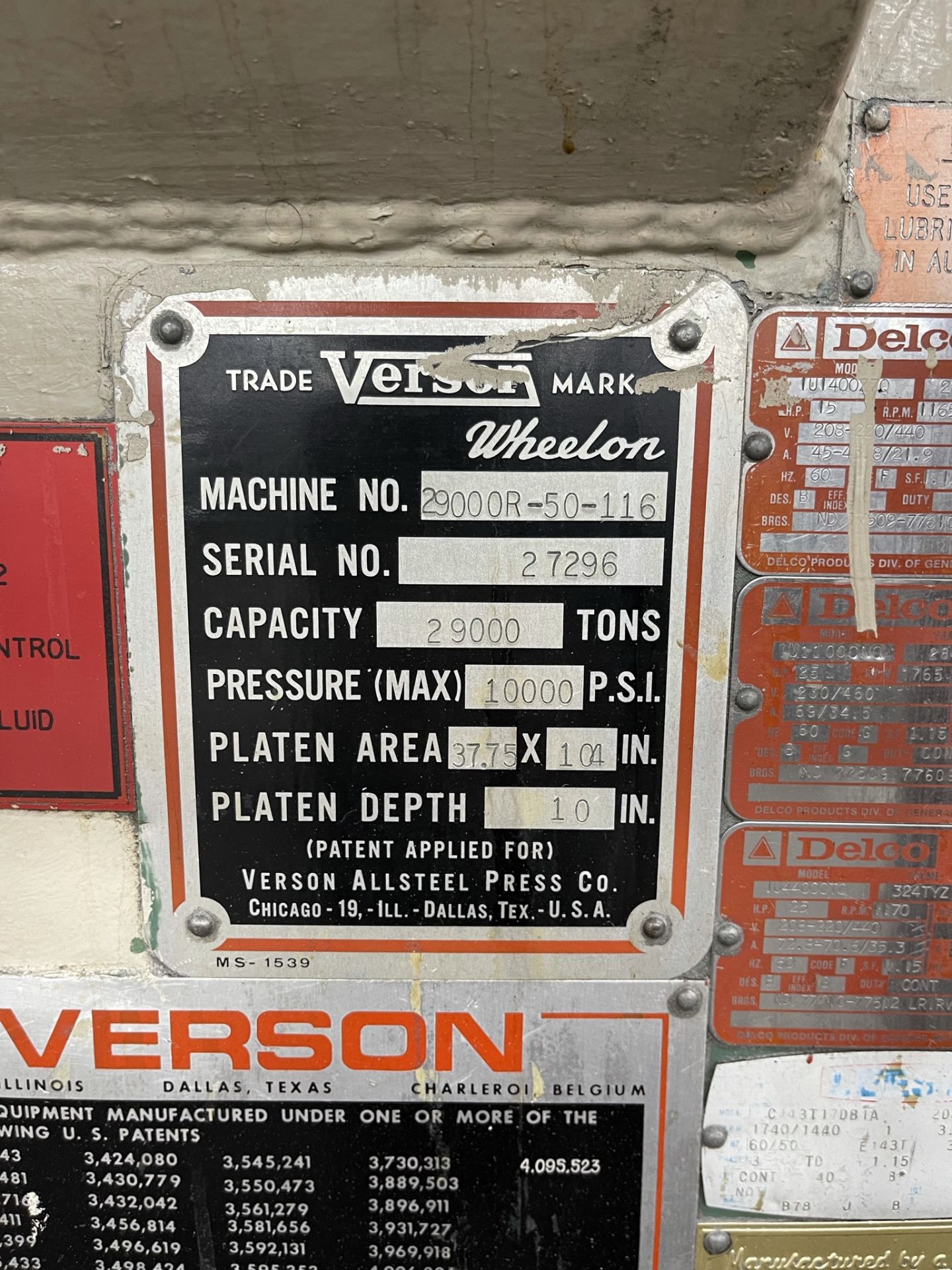 VERSON WHEELON, MODEL 29000R-50-116, FLEX-DIE RUBBER PAD, S/N 27296, FLUID FORMING CAPACITY TONNAGE 29,000 FORMING PRESSURE: THRU 10,000 P.S.I., TRAYS: TWO TRAY SIZE AT TOP 50″ X 116″ (1,270 MM X 2,946.4 MM) RIGHT TRAY AREA AT A 6 INCH (152.4MM) DEPTH 42″ X 109″ (1,079.5 MM X 2,768.6 MM), LEFT TRAY AREA AT A 10 INCH (254 MM) DEPTH 37″ X 104″, MOTOR DRIVES: ALL MOTORS WIRED 440 VOLTS, 3 PHASE, (2) EVACUATE HIGH PRESSURE PUMPS 75 HP & 150 HP, (1) ACC PUMP 30 HP (1) PILOT PUMP 20 HP, (1) VACUUM PUMP 15 HP, (1) FILTER PUMP 1/4 HP, CONTROLS: WIRED 115 VOLTS, OPERATOR CONTROL STATION LOCATED CENTER OF BARREL, (2) SIDE CONTROLS STATIONS LOCATED AT END OF EACH BARREL WITH EMERGENCY STOP BUTTONS, EQUIPPED WITH: (1) POWER UNIT AND OIL RESERVOIR, (1) NITROGEN INTENSIFIER PUMP. (2) THROW PAD ROLL-UP DEVICE FOR EACH TABLE, (1) ACCUMULATOR HYDRAULIC OIL STORAGE TANK, (1) FLUID CELL, (1) RUBBER PAD ELECTRICAL STARTER PANELS, COMPLETE FACTORY SAFETY GUARDS, DIMENSIONS 342.16″ L-R X 120″, F-B X 1873/8″ HEIGHT WITH FILL LINES, MAIN CHAMBER WITH FILL LINES, HEIGHT ABOVE GROUND 161 7/8″ (428.63 MM), POWER UNIT AND OIL RESERVOIR F-B 96″ X 178″ (2,438.4 MM X 4,521.2 MM, INTENSIFIER 33″ X 33″ X 132″ HT. (38.2 MM X 838.2 MM X 3,352.8 MM), ACCUMULATOR 80″ DIAMETER X 186″ HT. CONTROL PANEL 144″ LR X 18″ FB X 91″ HT., APPROX. WT. 363,700 LBS, (2,032 MM DIAMETER X 4,724.4 MM HT.) (3,657.6 MM FB X 457.2 FB X 2,311.4 MM HT